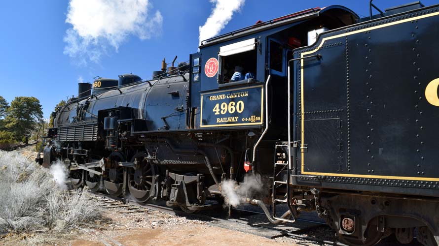 The next day, we took a 65-mile trip north on the Grand Canyon Railway from the historic Williams Depot (built in 1908 by the Santa Fe Railway) to the south rim of Grand Canyon National Park. On our way to the Grand Canyon, we rode in a 1948 California Zephyr Dome Car. The train was pulled by a fully restored former Burlington Steam Engine #4960 that was built in 1923. The Grand Canyon Depot is one of the only remaining log depots still in use in the country. Both stations also had static train displays of other engines and railroad cars.