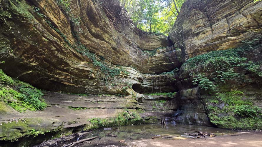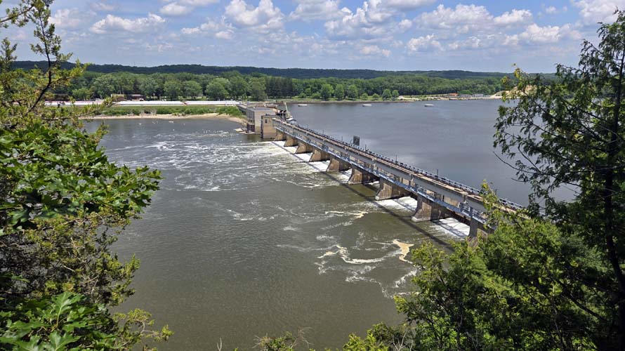 Driving south to the Illinois River, we stopped briefly at the Norwegian Settlers Memorial (commemorating the first Norwegian settlement in the Midwest) and the nearby Crop Duster Memorial. Reaching the river near Utica, we spent several hours hiking at Starved Rock State Park. The park is the most popular state park in Illinois, and we enjoyed hiking among the stunning bluffs and canyons. Our 2.5-mile trail took us to several noteworthy sites including Lovers Leap, Eagle Cliff, a lock and dam on the Illinois River, Wildcat Canyon (with a 90-foot waterfall), French Canyon, and more. It was a very hot and humid day, and the longest hike Elizabeth has done, so everyone earned ice cream at the visitor center upon our return.