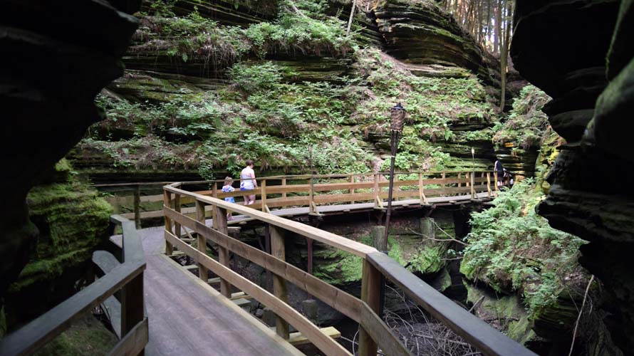 Also in Wisconsin Dells, we enjoyed a round of mini golf at Timber Falls Adventure Park and took a two-mile ride through the woods on the Riverside & Great Northern Miniature Railway. At the poison ivy infested Rocky Arbor State Park, we hiked the loop trail around the sandstone bluffs. Then, we enjoyed the Dells Boat Tour of the Upper Dells. This two-hour scenic boat ride stopped at Witches Gulch, where we hiked through a narrow rock canyon, and we also stopped at Stand Rock to watch a dog jump to the rock pillar from the cliff side.